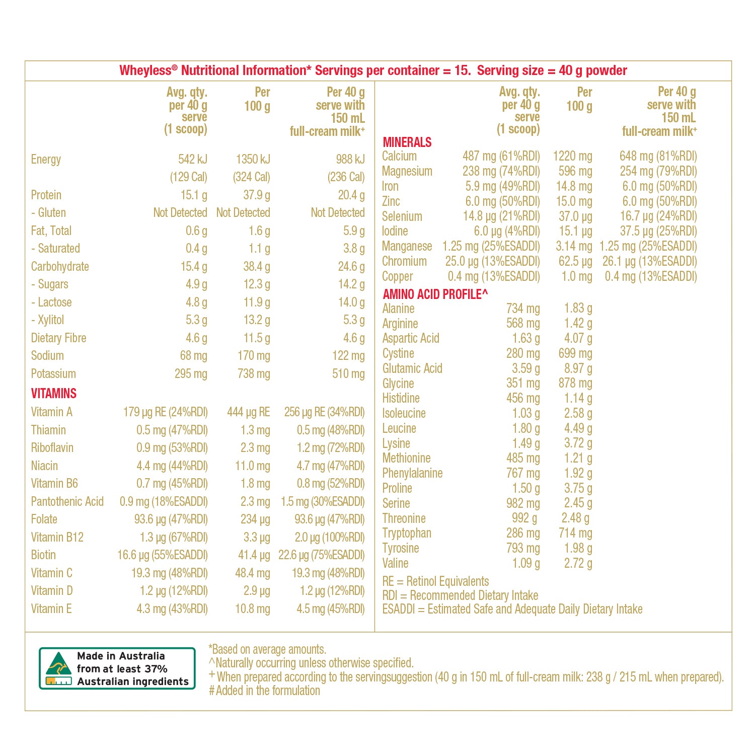Wheyless desserts contain 15 - 16.1g protein per serve made from ultra-purified whey protein isolate and high-grade concentrate derived utilising cold, enzymatic, ultrafiltration techniques.